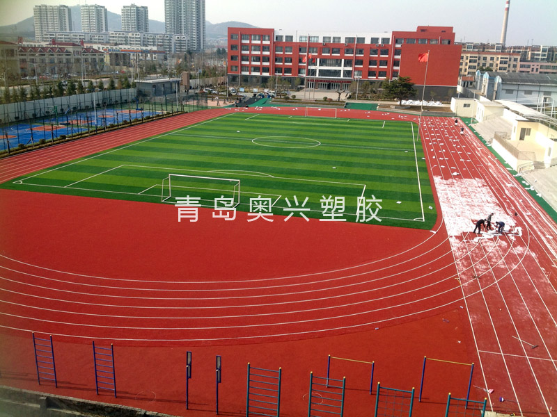 环保混合型塑胶跑道采用国际田联认可的混合结构,面层为PU颗粒或EPDM耐候性环保彩色颗粒,母体是全PU掺合部分橡胶颗粒。施工工艺简单,符合国际赛事标准。标准厚度13mm。