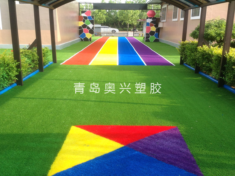 环保幼儿园人造草坪养护简单,费用低,用清水冲洗即可去除污垢,而且具有不褪色、不变形的特点,可在各种基础表面安装,基础质量要求不高,不怕开裂,无起泡脱层之忧,既简单又经济。人造草坪场地使用率高,既减震、又无噪音、安全无毒、富有弹性,阻燃性能好等特点,很适合于幼儿园学校使用,是现时最佳的活动、训练、比赛场地。