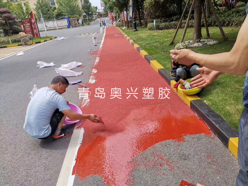 3、底涂施工、当基面是水泥时用户外道路专用粘接底料按配比搅拌均匀后用辊筒滚涂施工,在沥青路面施工时不用涂刷底涂;